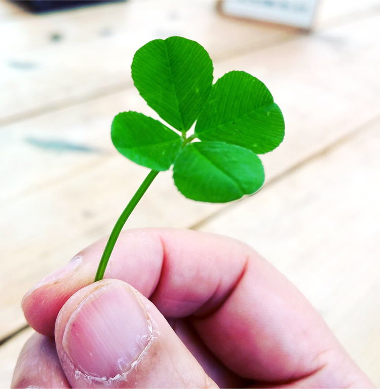 バスハイクで、BBQ場のそばの草原で、とても綺麗な四つ葉のクローバーを見つけたので、近くのカフェで写真を撮りました。たいへん元気をもらえました。
